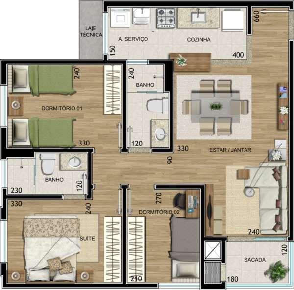 - 03 DORMITÓRIOS SENDO 1 SUÍTE